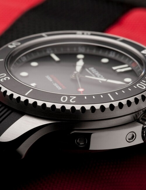 材质:硬化不锈钢Bremont Trip-Tick®结构,防刮DLC处理 直径43mm,表耳间距22mm,表壳厚16mm。