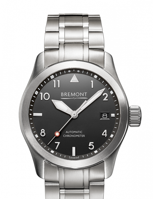 SOLO 37 整体特点 BE-36AE自动计时器,38小时动力储存 37毫米不锈钢Bremont Trip-Tick®表壳结构 防水10 ATM,100米 黑色皮革表带