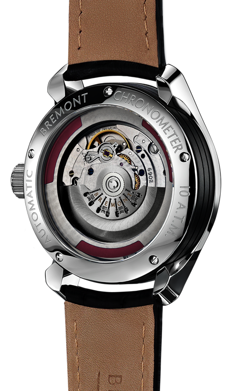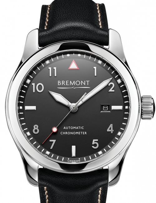 SOLO 系列特点 改装机芯11½”’BE-36AE自动机芯,38小时动力储存 硬化抛光不锈钢Bremont Trip-Tick®表壳结构 防水10 ATM,100米 黑色皮革表带